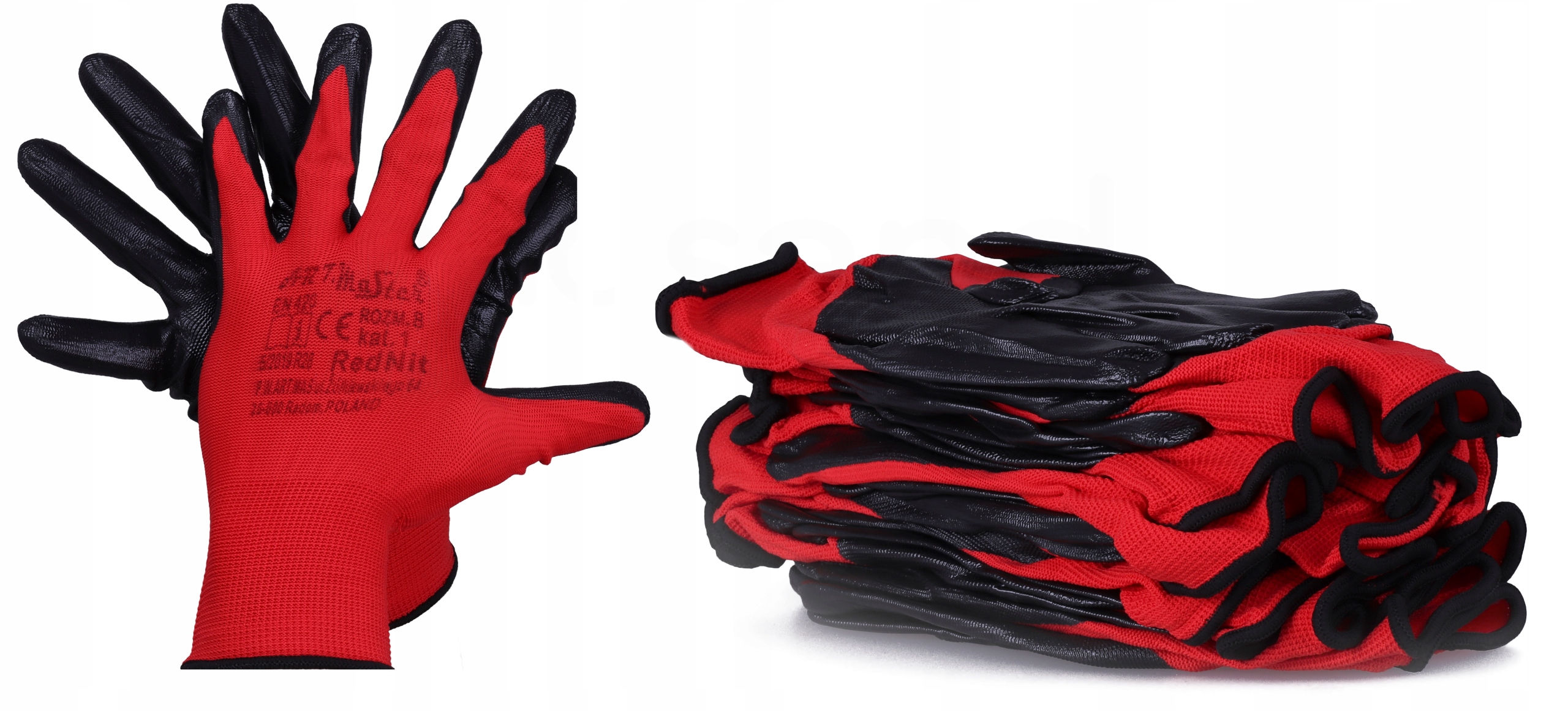 Wykonane z dzianiny poliestrowej w kolorze czerwonym, powlekane nitrylem w kolorze czarnym.