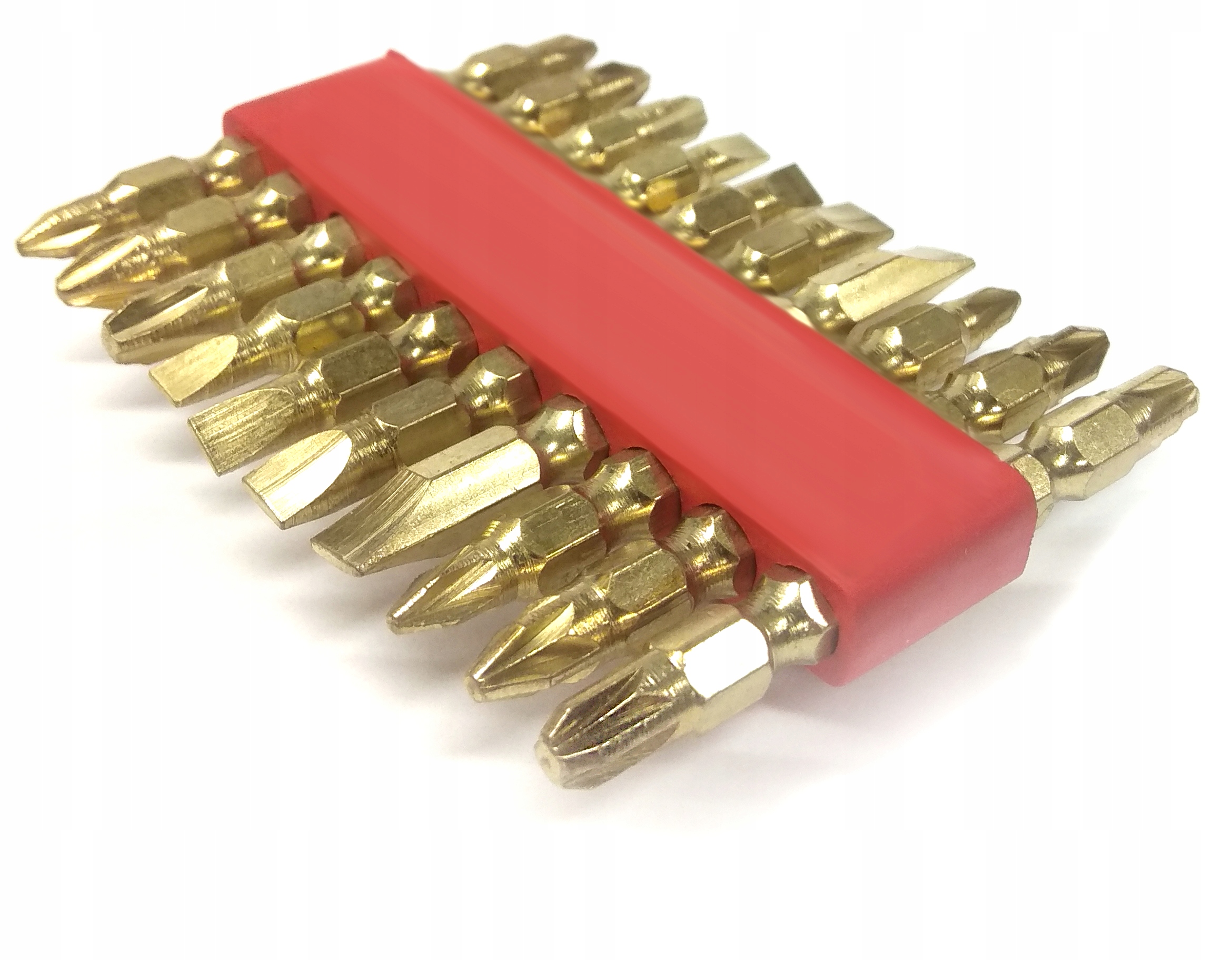 hartowane bity ułożone w gumowym organizerze, z możliwością przypięcia do paska. Każdy bit dwustronny o długości 65 mm.