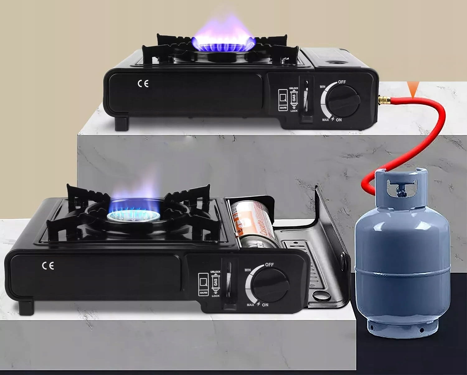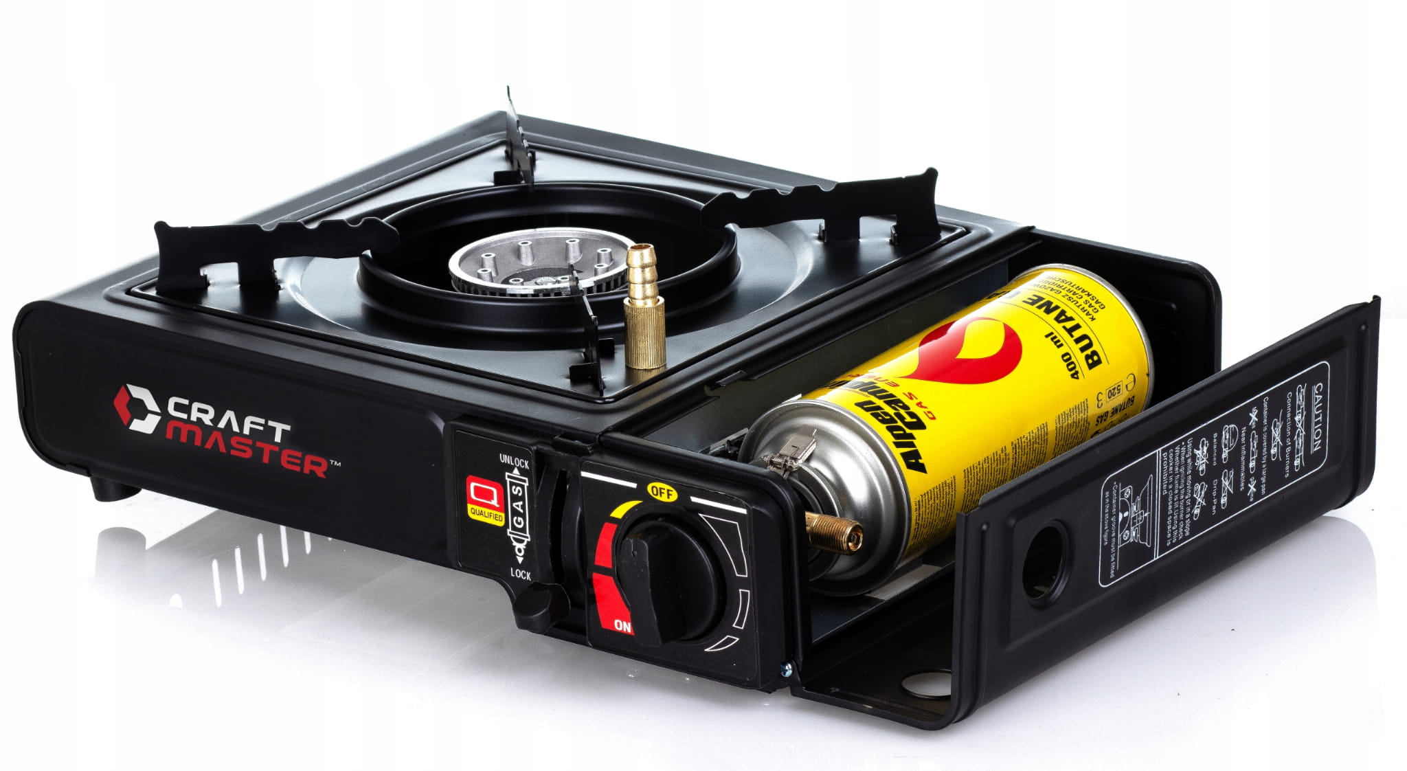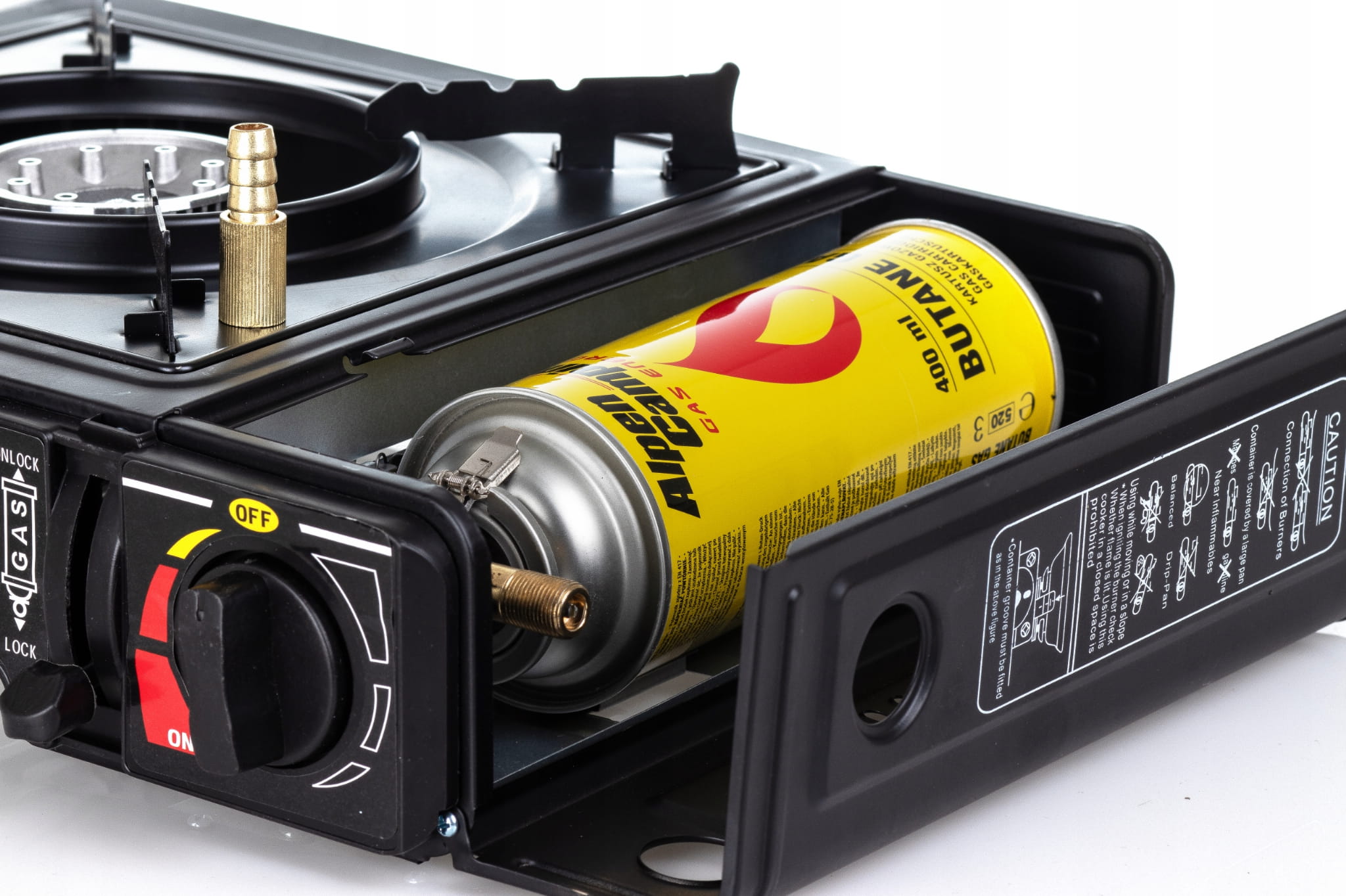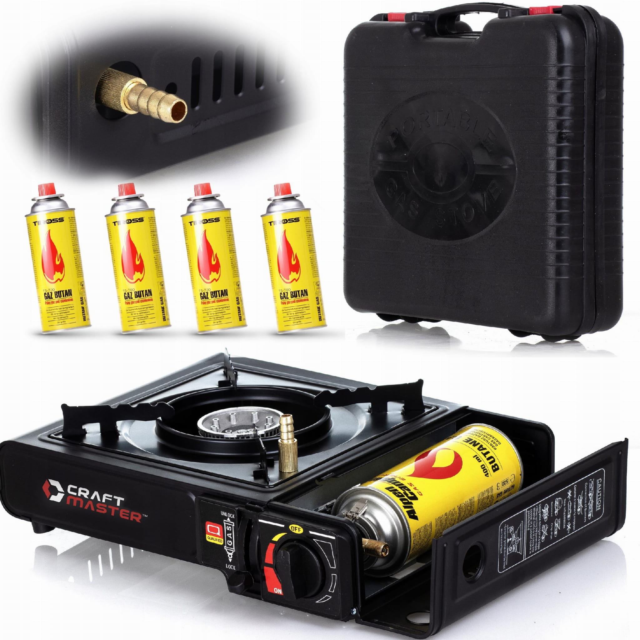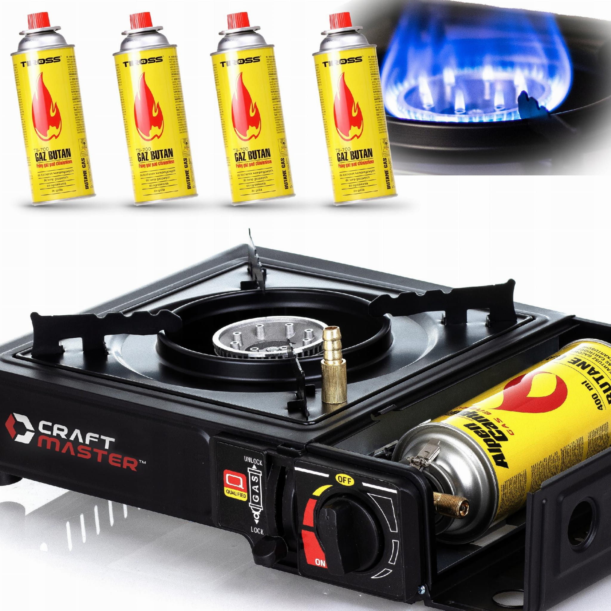 - Zasilanie: Kartusz gazowy (wtykowy) lub butla gazowa (poprzez adapter)