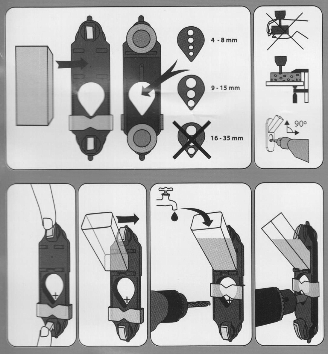 Dzięki mocowaniu na przyssawkę, prowadnica pozwala wykonywać otwory na powierzchniach poziomych i pionowych dokładnie w wyznaczonym miejscu, bez ryzyka przesunięcia się wiertła.